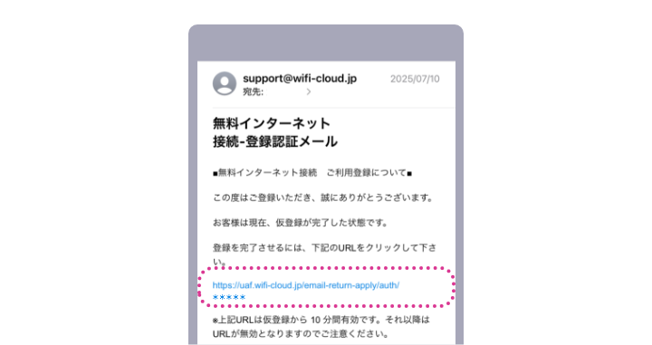 support@wifi-cloud.jpから「無料インターネット接続- 登録認証メール」というメールが届きますので、メール本文に記載された登録完了のURLをタップします。