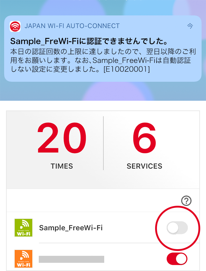 大多数免费Wi-Fi服务设有一天的使用次数限制。如果达到使用次数的上限,当天即使连接Wi-Fi,也无法使用网络连接。此时,将显示如图所示的错误通知,关闭自动身份验证。