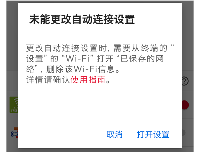 在操作“自己以前使用过的网络”或“通过其他应用程序保存的网络”的自动连接设置时,有时会显示如图所示的界面,无法更改自动连接设置。