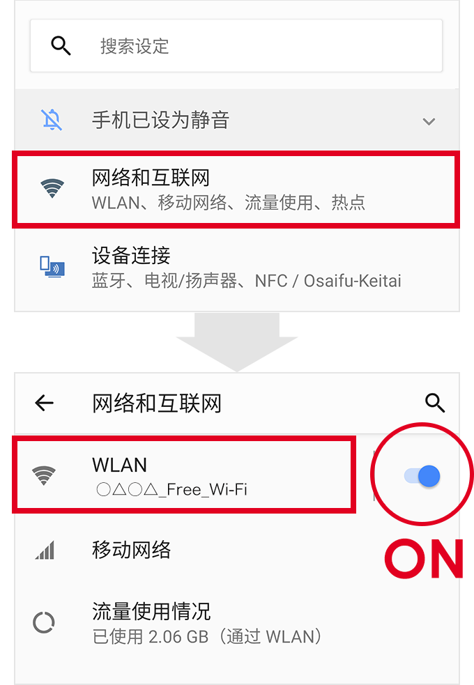 通过“网络和互联网”等,将“WLAN”设置为“ON”。