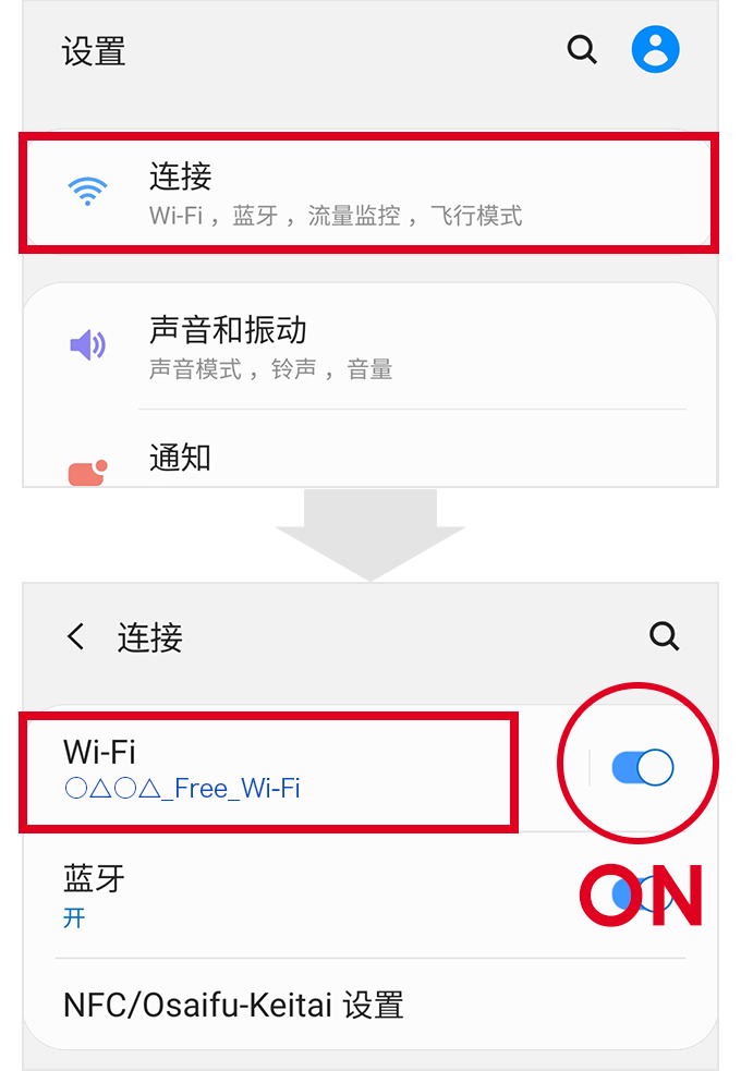 通过“连接”等,将“Wi-Fi”设置为“ON”。
