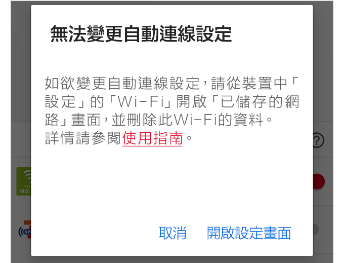 在操作「曾經使用過的網路」或「透過其他應用程式儲存的網路」的自動連接設定時,有時可能會顯示如圖所示的畫面,且無法更改自動連接的設定。