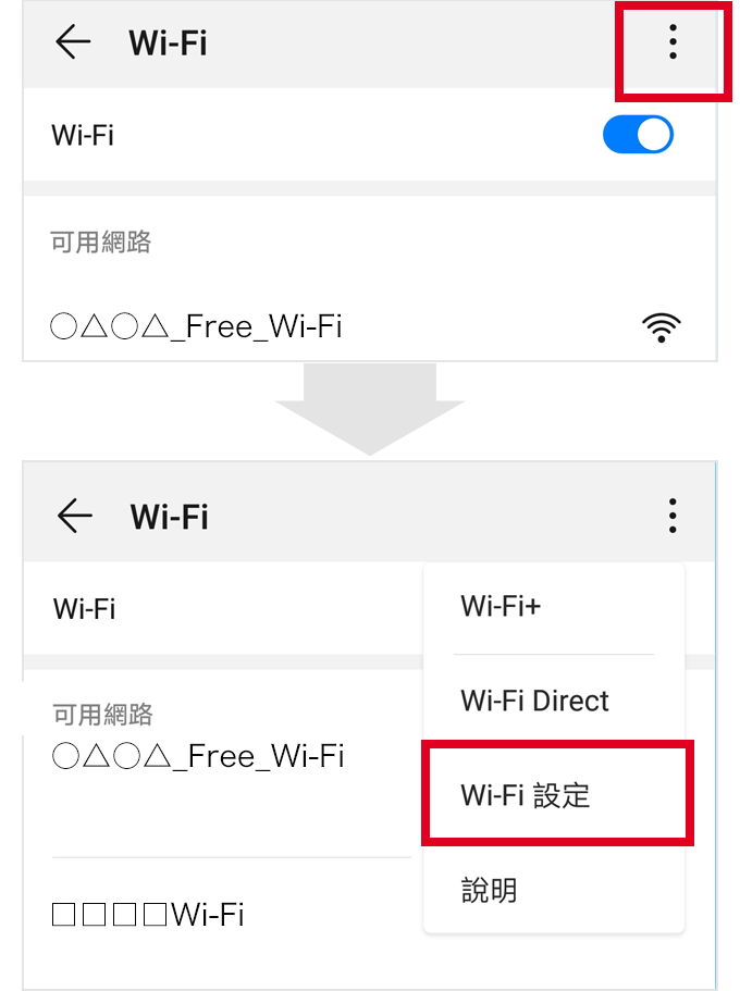 開啟選單後,點選「Wi-Fi設定」。(也有顯示「Wi-Fi詳細資訊」等情形。)