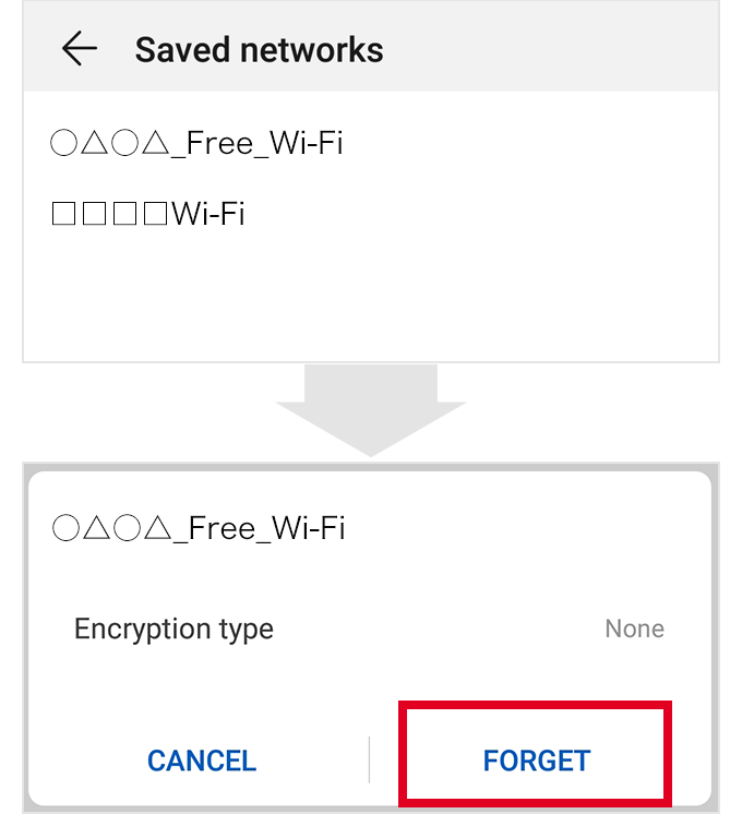 When you tap the network name, a dialogue appears. Tap “FORGET”.