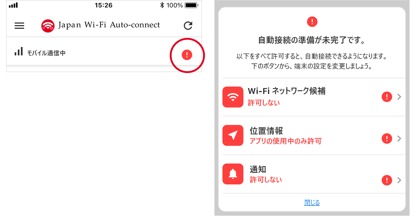- アプリを起動して、画面に「!」マークまたは「自動接続の準備が未完了です。 」という画面が表示されていないか確認します。