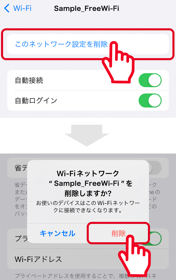 「このネットワーク設定を削除」をタップして、ネットワーク設定を削除します。