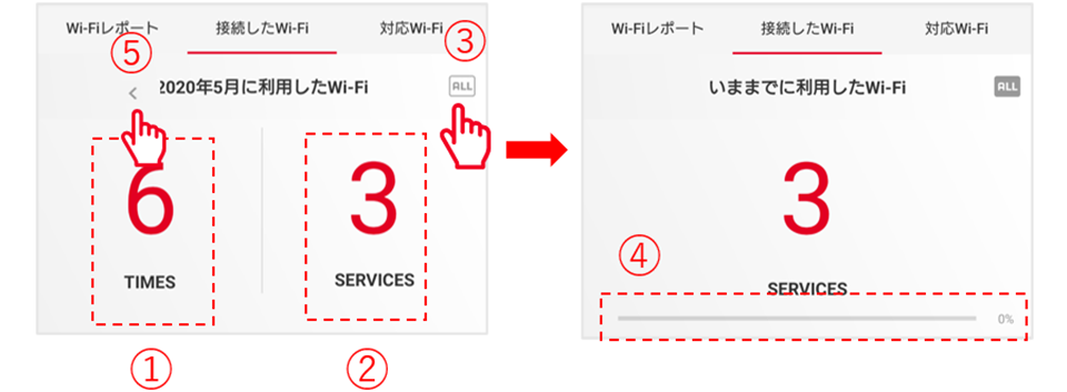 ⑤当月、前月、前々月の接続したWi-Fiの数を確認することができます。