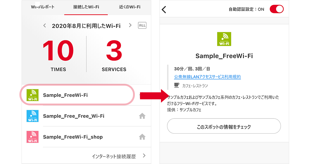 「いままでに利用したWi-Fi」では、これまでに利用した、すべての対応Wi-Fiサービスを確認できます。