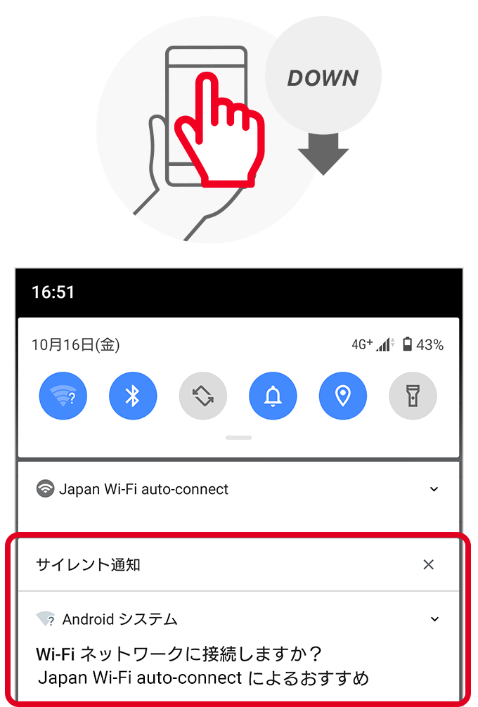 端末の通知欄を開いて「Wi-Fiネットワークに接続しますか? Japan Wi-Fi auto-connectによるおすすめ」という通知を確認します。