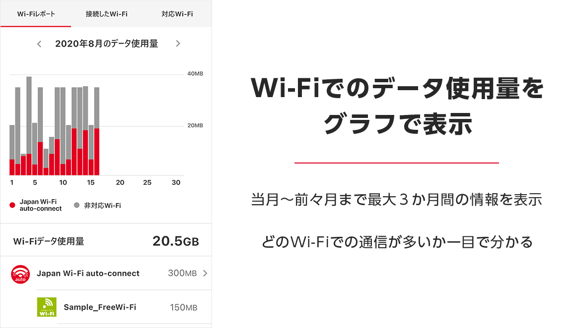 通信データ使用量はJapan Wi-Fi auto-connect対応Wi-Fi、非対応Wi-Fi、モバイル通信の3つに分類し、集計されます。 フリーWi-Fiを賢く使えているか、チェックしてみるものいいかもしれませんね。Wi-Fiレポートで通信データ使用量を確認しよう【AndroidTM版】