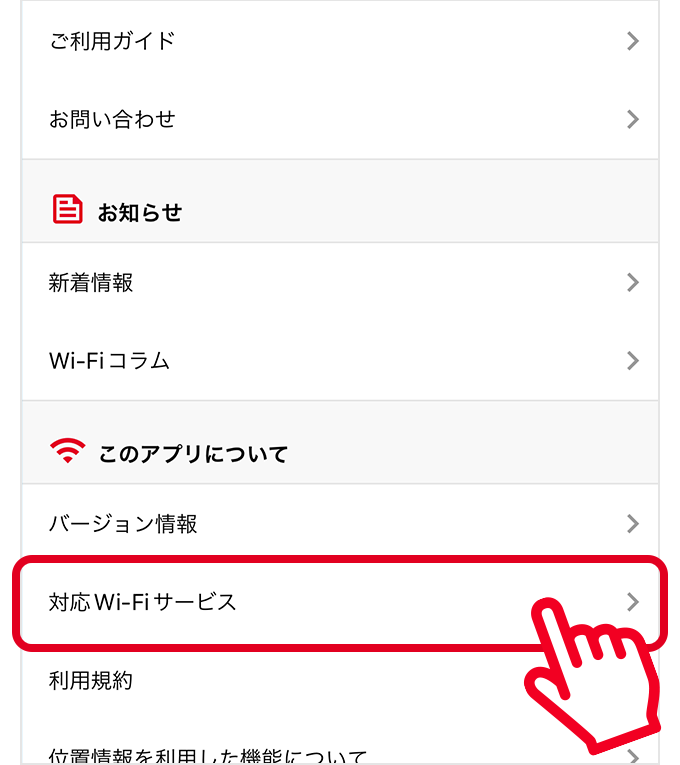 「接続したWi-Fi」や「対応Wi-Fi」で、Wi-Fiサービスをタップすると、利用条件やエリアのご紹介などの情報を確認することができます。