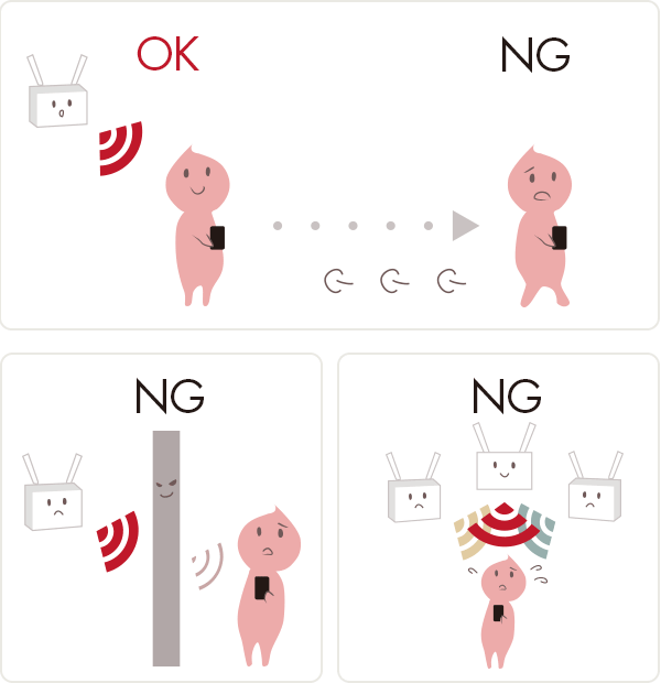 전파가 약하거나 접속과 끊김이 반복되는 등 전파 환경이 나쁜 경우에는 장소를 이동하거나 하여 전파 환경이 좋은 장소에서 다시 한 번 확인해 주십시오.