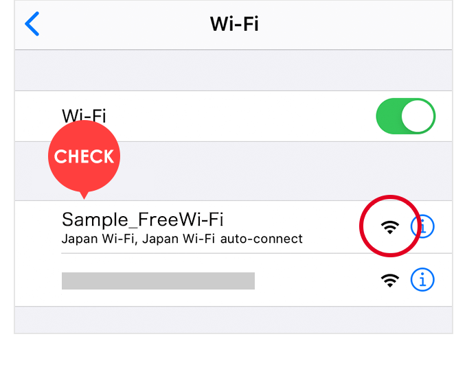 단말의 "설정" 등에서 "Wi-Fi"를 열고 접속하고 싶은 Wi-Fi 네트워크 이름이 표시되어 있는지를 확인해 주십시오.