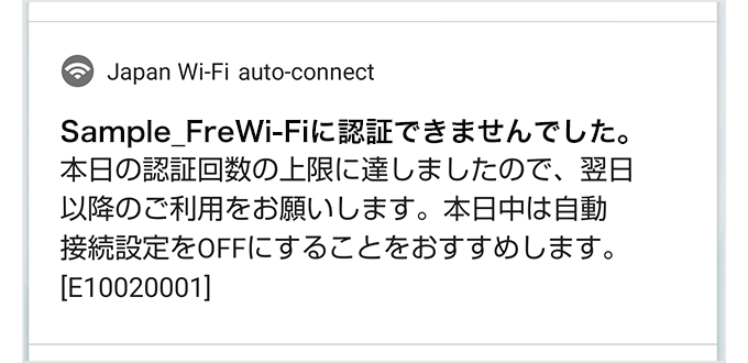 무료 Wi-Fi 서비스의 대부분은 하루 이용에 횟수 제한을 두고 있습니다. 하루 이용 횟수 상한에 도달했을 경우에 이 에러가 표시됩니다.