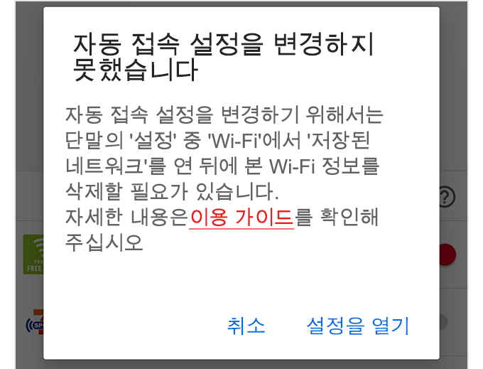 '이전에 직접 이용하신 적 있는 네트워크'나 '다른 앱에 의해 저장된 네트워크'의 자동 접속 설정을 조작하실 때, 그림과 같은 화면이 표시되면서 자동 접속 설정을 변경할 수 없는 경우가 있습니다.
