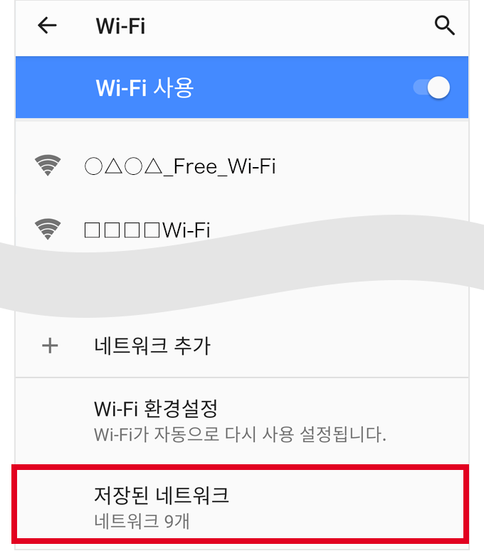 화면 아래 부분에 '저장된 네트워크' 표시가 있으니 눌러 주십시오.