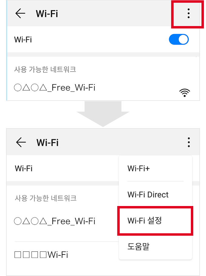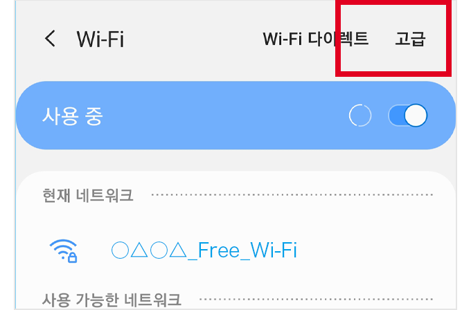 메뉴가 열리면 'Wi-Fi 설정'을 누릅니다. ('Wi-Fi 고급' 등인 경우도 있습니다. )