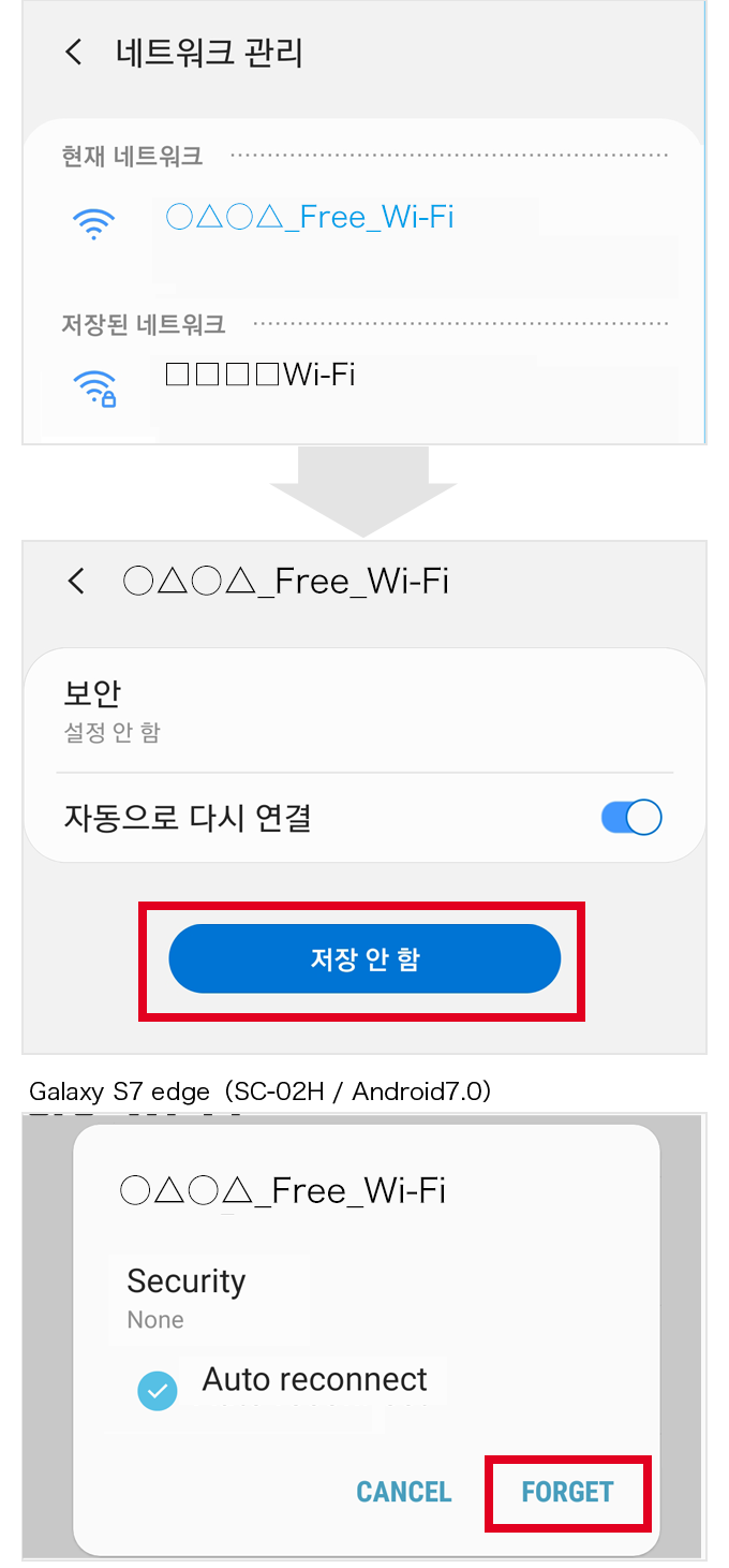 Japan Wi-Fi- Auto-connect에 대응하는 네트워크의 경우에는 이 설정을 삭제해도 앱 화면에서 자동 접속 설정을 'ON'으로 하면 다시 자동 접속을 할 수 있게 되므로 삭제해도 문제가 없습니다.