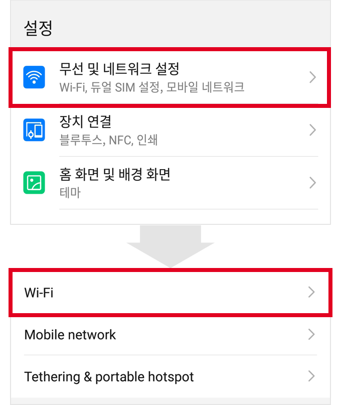 '무선 및 네트워크 설정' 등에서 'Wi-Fi'를 선택합니다.