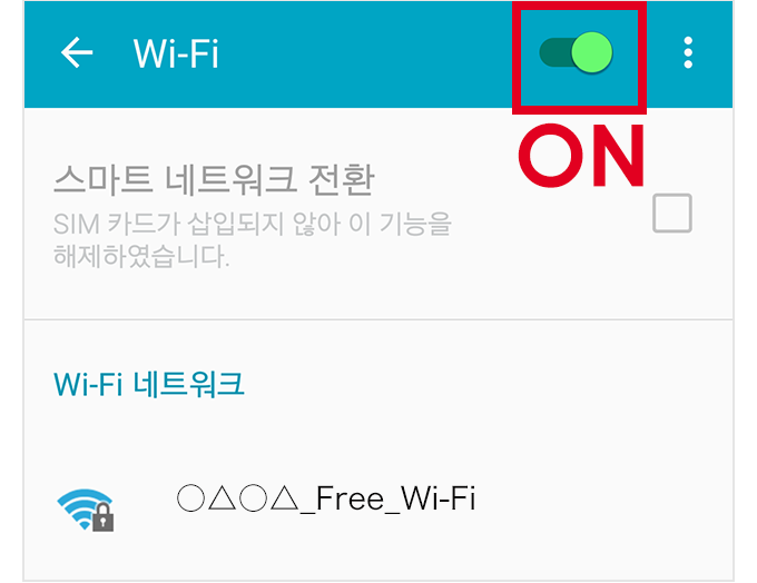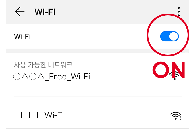 'Wi-Fi'를 'ON'으로 하고 Wi-Fi 화면을 엽니다