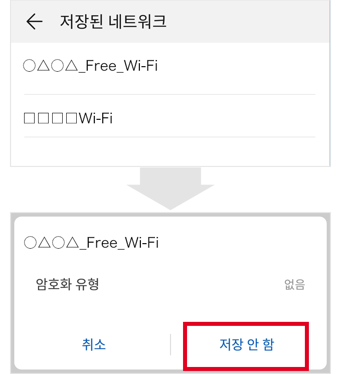 네트워크 이름을 누르면 대화창이 표시됩니다. '저장 안 함'을 눌러 주십시오.