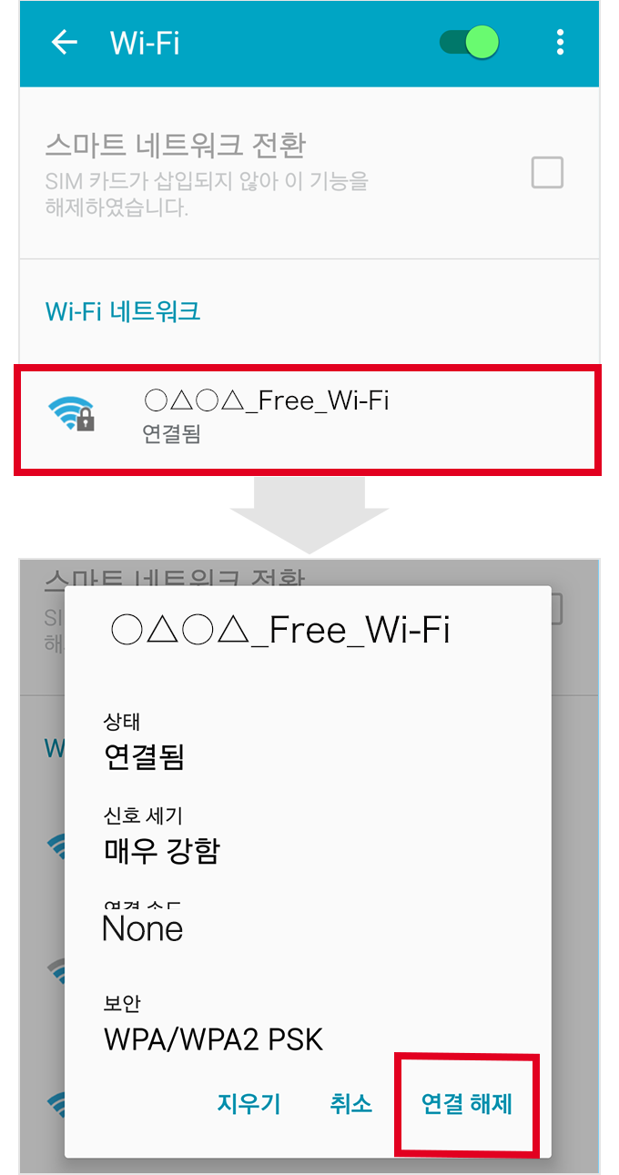 네트워크 이름을 누르면 대화창이 표시됩니다. '지우기'를 눌러 주십시오.