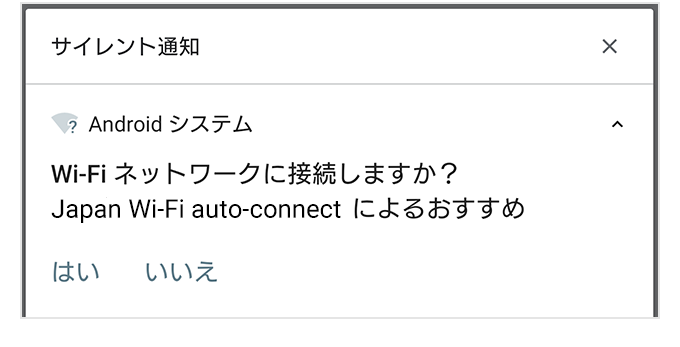 무음 통지가 오지 않는 경우는 아래를 참고 해 주십시오.「Wi-Fiネットワークに接続しますか? Japan Wi-Fi auto-connectによるおすすめ」というサイレント通知が届きません。【Android 10】