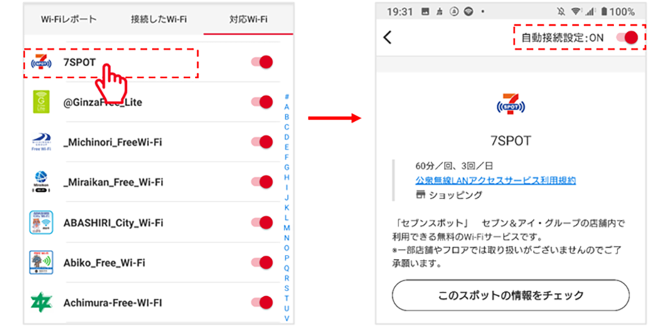 '접속한 Wi-Fi' 및 '대응 Wi-Fi'에서 Wi-Fi 서비스를 누르면, 이용 조건 및 지역 소개 등의 정보를 확인할 수 있습니다 더불어 '접속한 Wi-Fi'에서 확인할 수 있는 이력 기간을 연장하였습니다. 지금까지 이용한 모든 대응 Wi-Fi 서비스를 확인할 수 있으므로 100%를 목표로 마음껏 이용해 주세요!