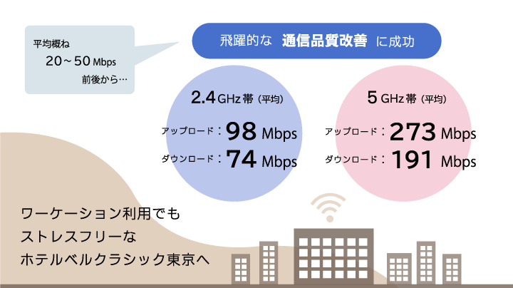 ホテルベルクラシック東京では、今後の更なる需要増を見据え2021年にはPPPoE方式からIPoE方式への通信方式の変更を行い、更なる安定化と高速化を実現しています。