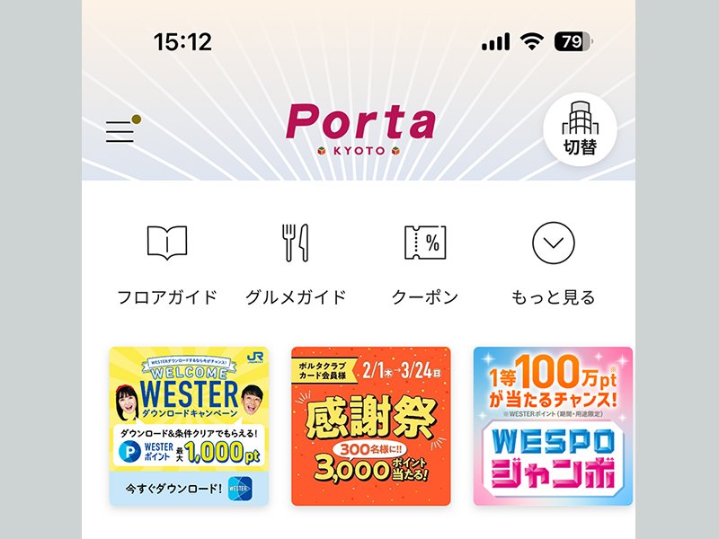 ポルタカードアプリ「WESPO」及びJR西日本グループ共通ポイントサービスアプリ「WESTER」の利用促進もフリーWi-Fiを通して実施すべく、これらのアプリに限っては、Wi-FiをONにし、KYOTO_PORTA(SSID)を選択するだけで、利用登録がなくてもシームレスにアプリをご利用いただけるような設定を行っています。