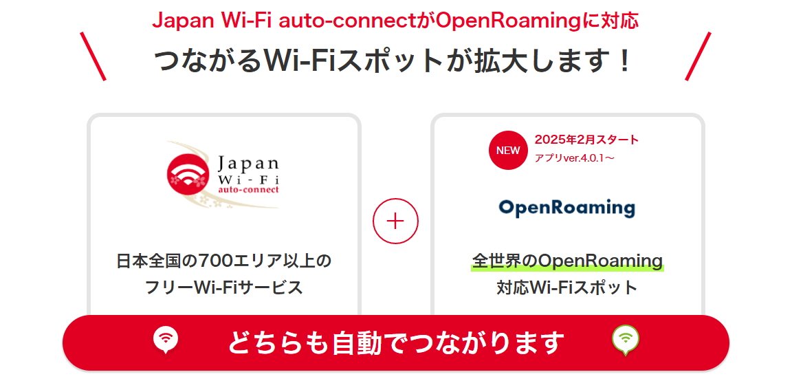 Japan Wi-Fi auto-connect、OpenRoamingに対応し、フリーWi-Fiの利用者は追加の手続きなしに自動で安全に接続可能。インバウンド需要にも対応します。