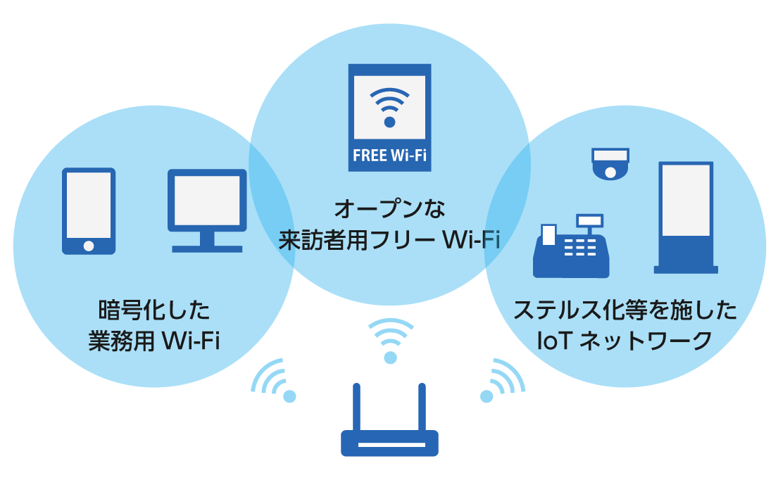 フリーWi-Fiと業務用Wi-Fiを重畳する利用も可能です。構築や保守に係る経費を大幅に削減可能です。