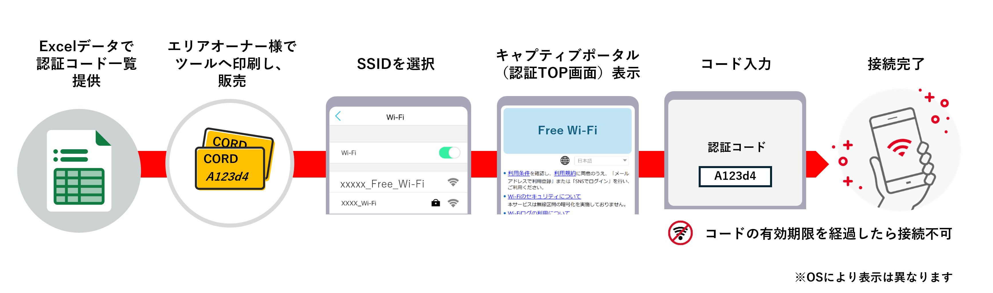 認証時にチケット等で事前に払い出ししたコード入力を条件とし、チケット等収益をベースに高速・大容量通信を安定的に提供します。