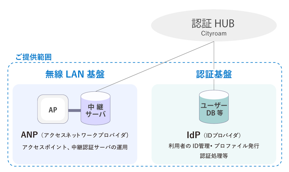 ANP(アクセスネットワークプロバイダ)としてアクセスポイントおよび、共通基盤の認証HUBへつなぐための中継サーバをご提供します。ユーザーが利⽤するためのIDを管理し接続プロファイルの発⾏等を⾏うIdP(IDプロバイダ)としての機能もお任せいただけます。